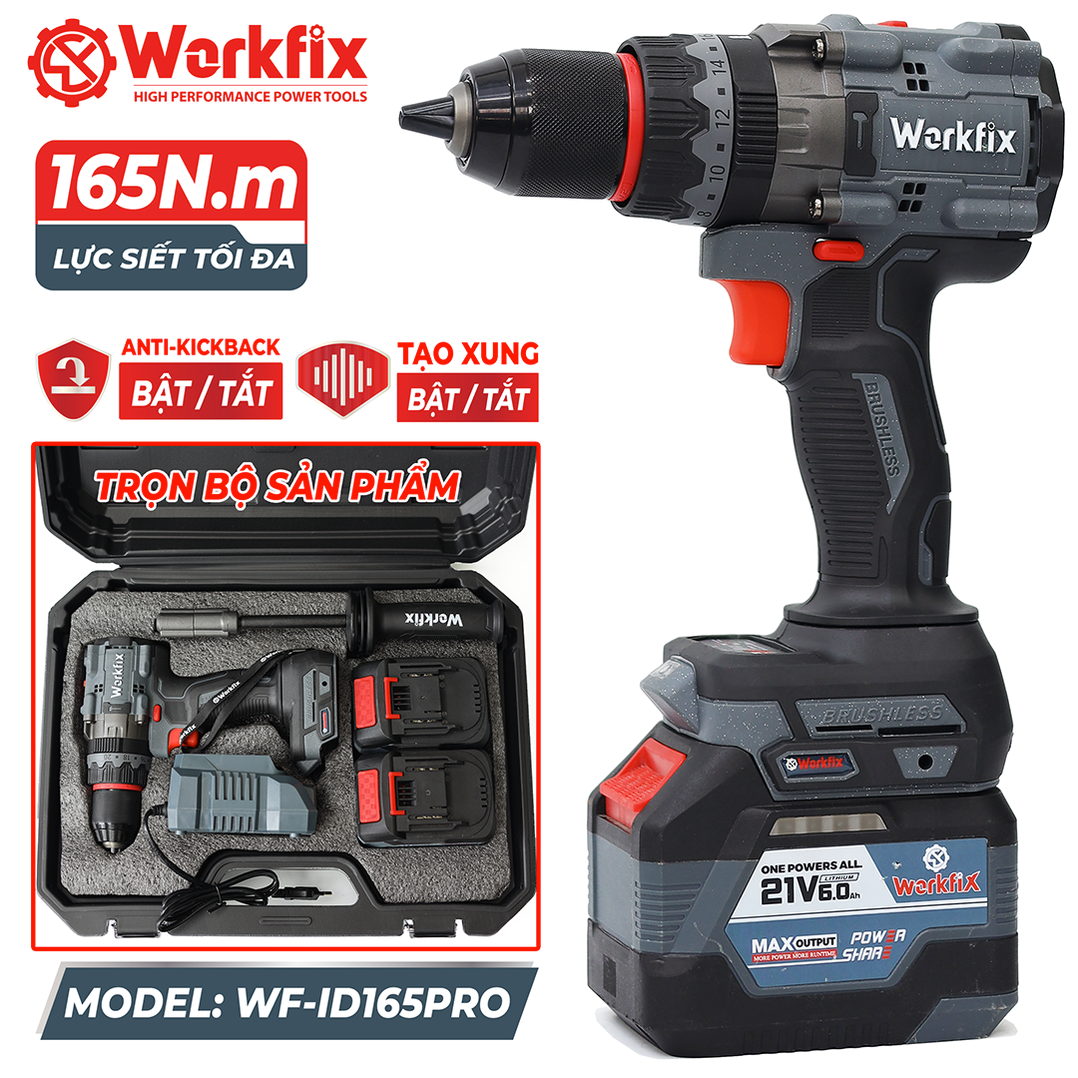 Máy khoan pin Workfix WF-ID165PRO, lực 165N, chống lật cổ tay, giảm chấn AVS